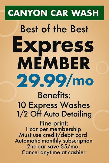 Quick, easy, and affordable! Wash your vehicle up to 5 times a month with one low monthly subscription. Enjoy automatic monthly charges for one vehicle per membership. Plus, get 50% off all detailing services! Cancel anytime at the cashier.